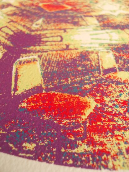 Photos showing the production of ‘Neither Hopeless Nor Helpless’ – a 7 layer screenprint by Lynne Blackburn, currently available to buy here.